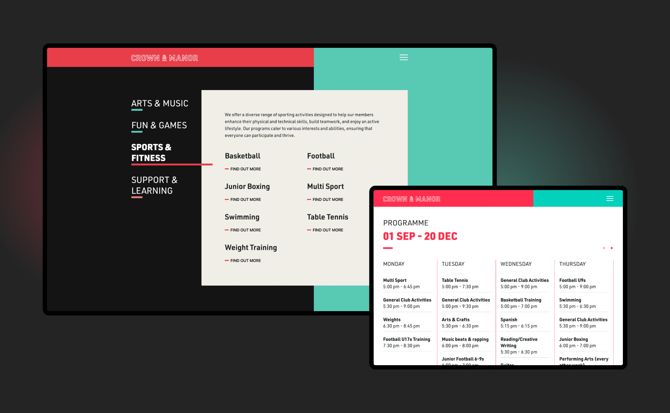 The Crown and Manor Club is a youth organisation in Hackney, North London, offering sporting, academic and recreational activities for boys and young men aged 7 to 25. We designed and developed a bold new website that reflects the club’s heritage while giving it a modern look, helping to promote its programmes and connect with the local community.