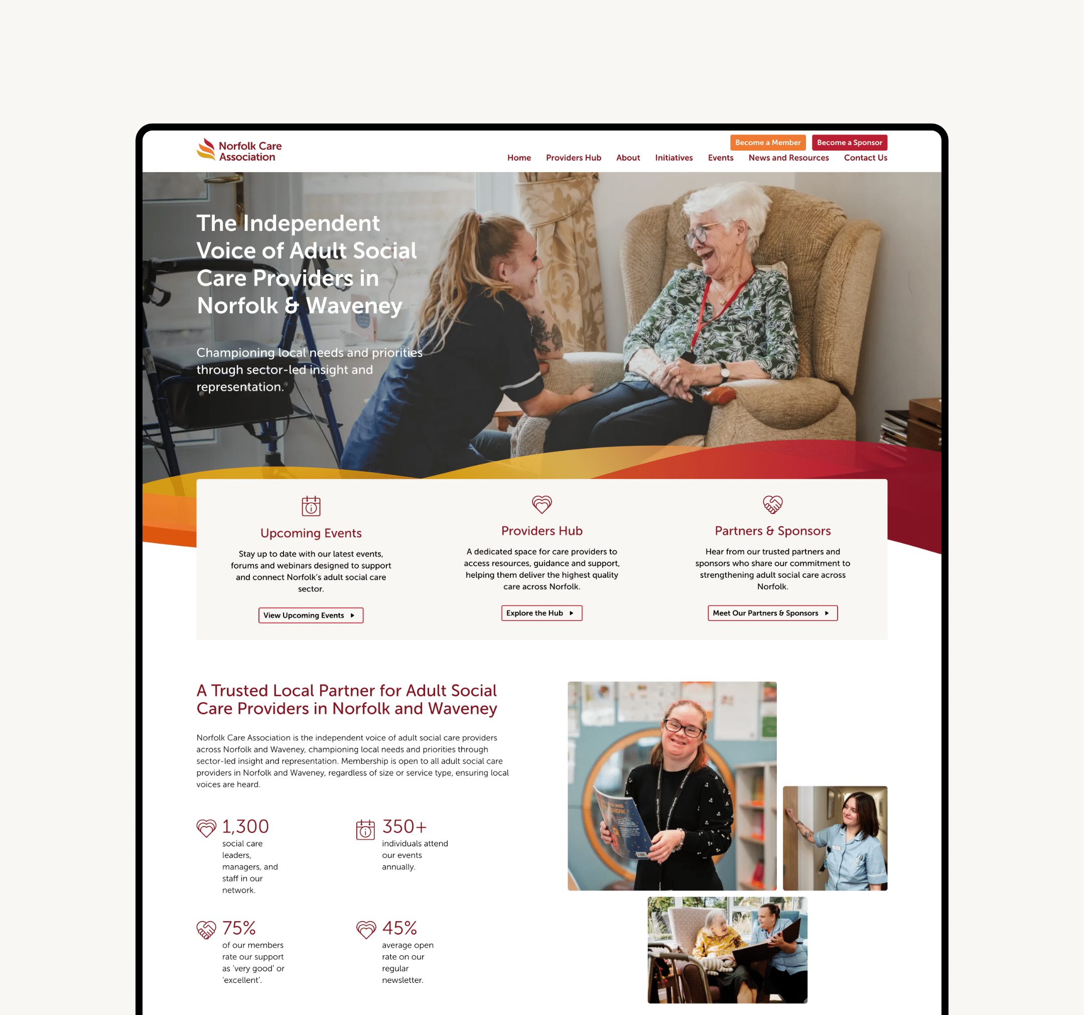 We were commissioned to design and develop a new website that clearly communicates the organisation’s role while improving access to resources, events and membership information. The website is designed to support a wide range of users, from care providers seeking guidance and partners engaging with the sector.