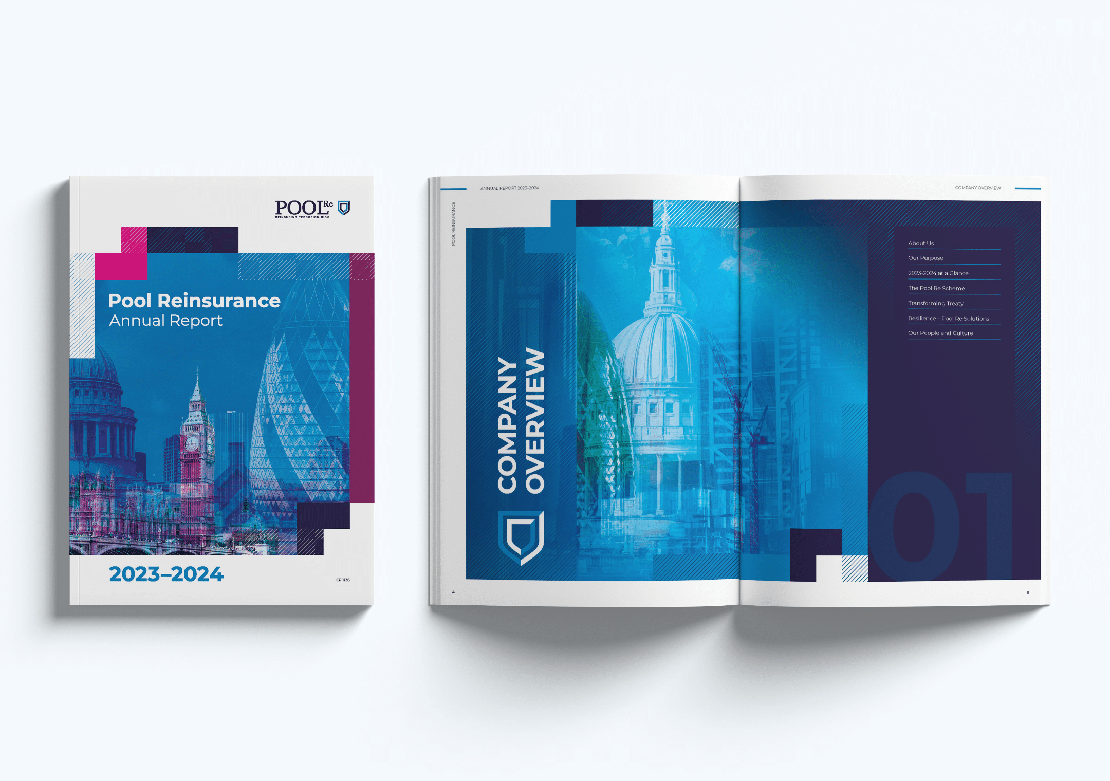 We were commissioned to design the 2024 Annual Report for PoolRe, the UK’s largest terrorism reinsurer. Established in 1993 and trusted by more than 150 insurers, PoolRe is globally recognised as a leader in terrorism risk financing. As an agency specialising in annual report design, we produced a publication that reflects the authority and expertise of the organisation while presenting complex information in a clear and engaging way.