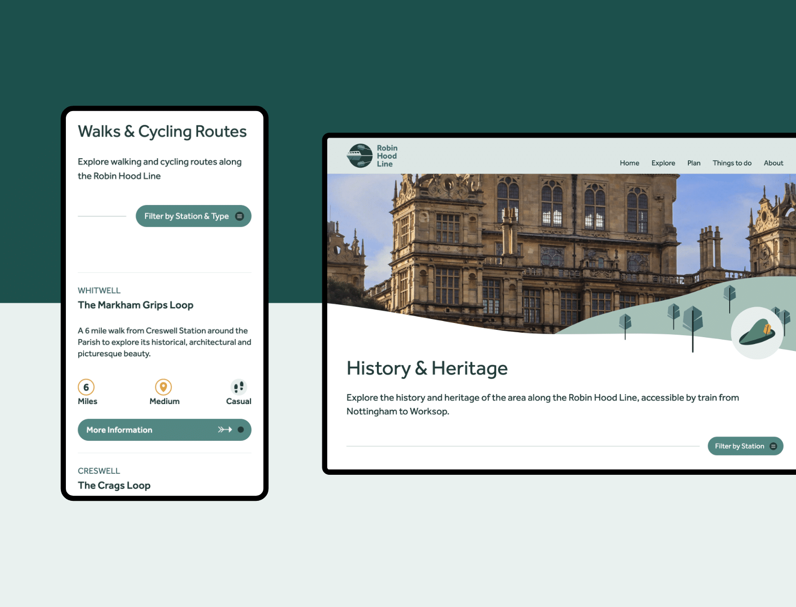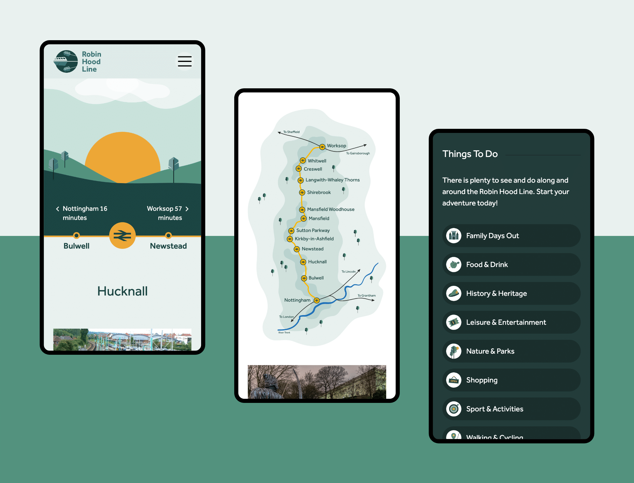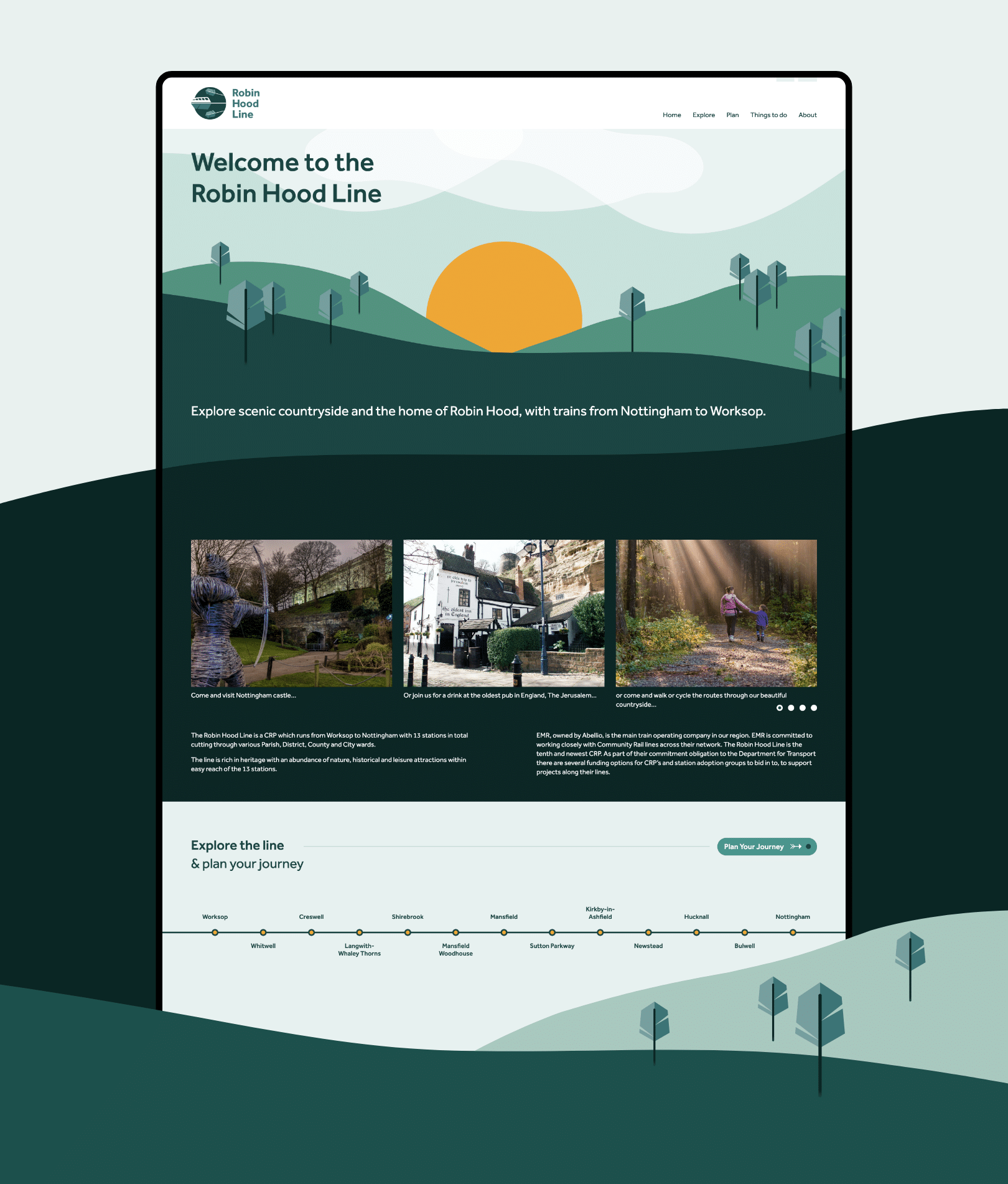 The Robin Hood Line is a Community Rail Partnership (CRP) that runs from Worksop to Nottingham, serving 13 stations. We were commissioned by Bolsover District Council to create a new brand identity and website for the community rail project, aimed at promoting the line and increasing community engagement. The result is a vibrant and accessible brand, paired with an intuitive and enjoyable website experience. Large-scale parallax animations, bespoke illustrations and interactive maps come together to form a visually engaging and easy-to-navigate website.