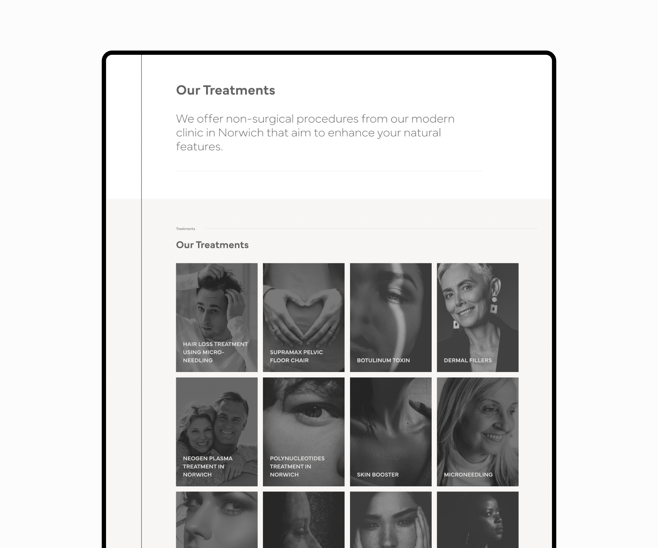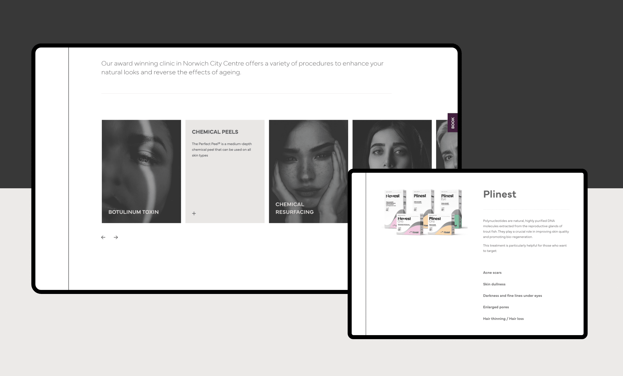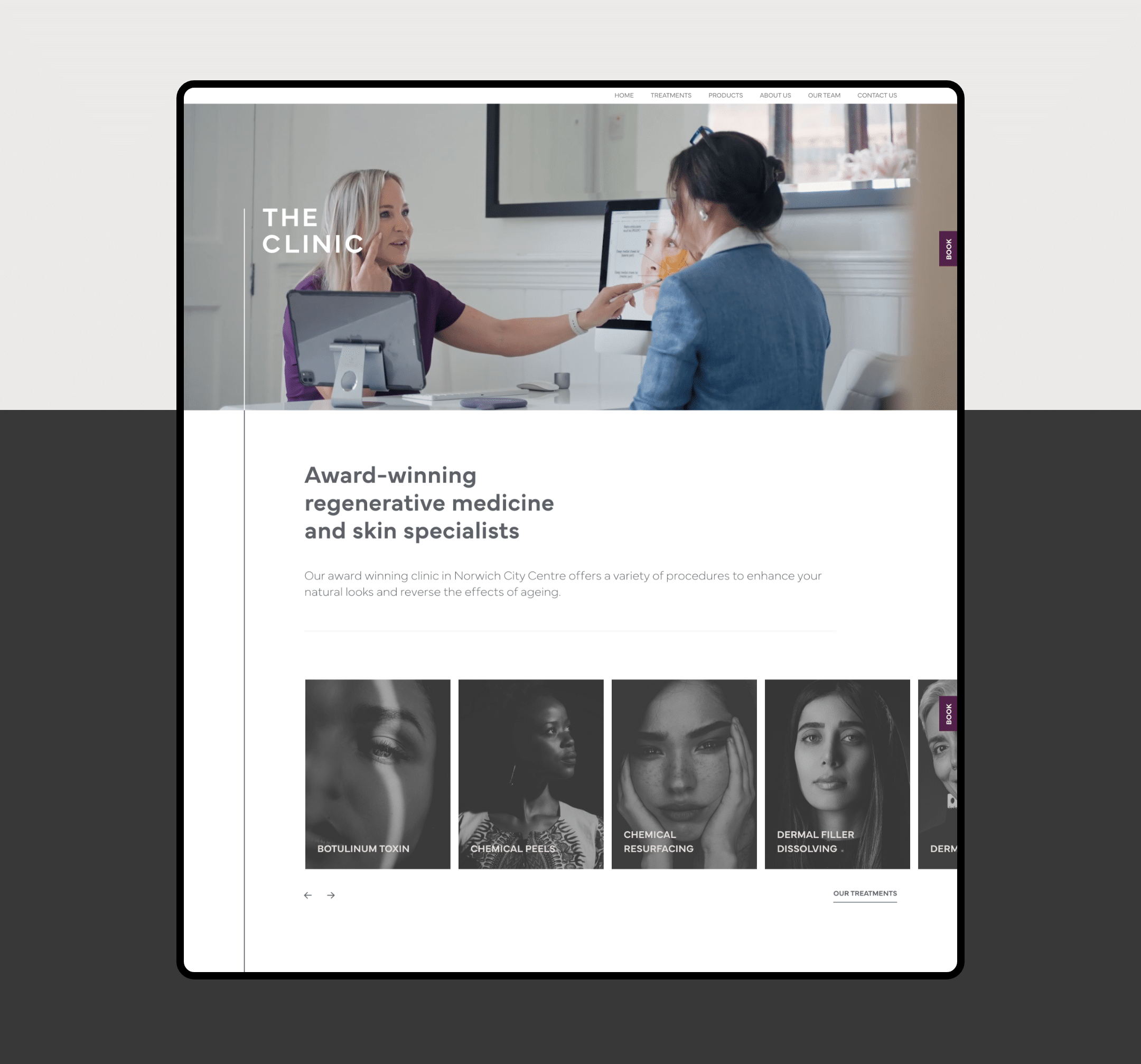 The website features a wide range of content, including video, interactive before-and-after image sliders and comprehensive treatment information. The content is presented within a clean, user-friendly design that reflects the aesthetic clinic’s premium brand identity.