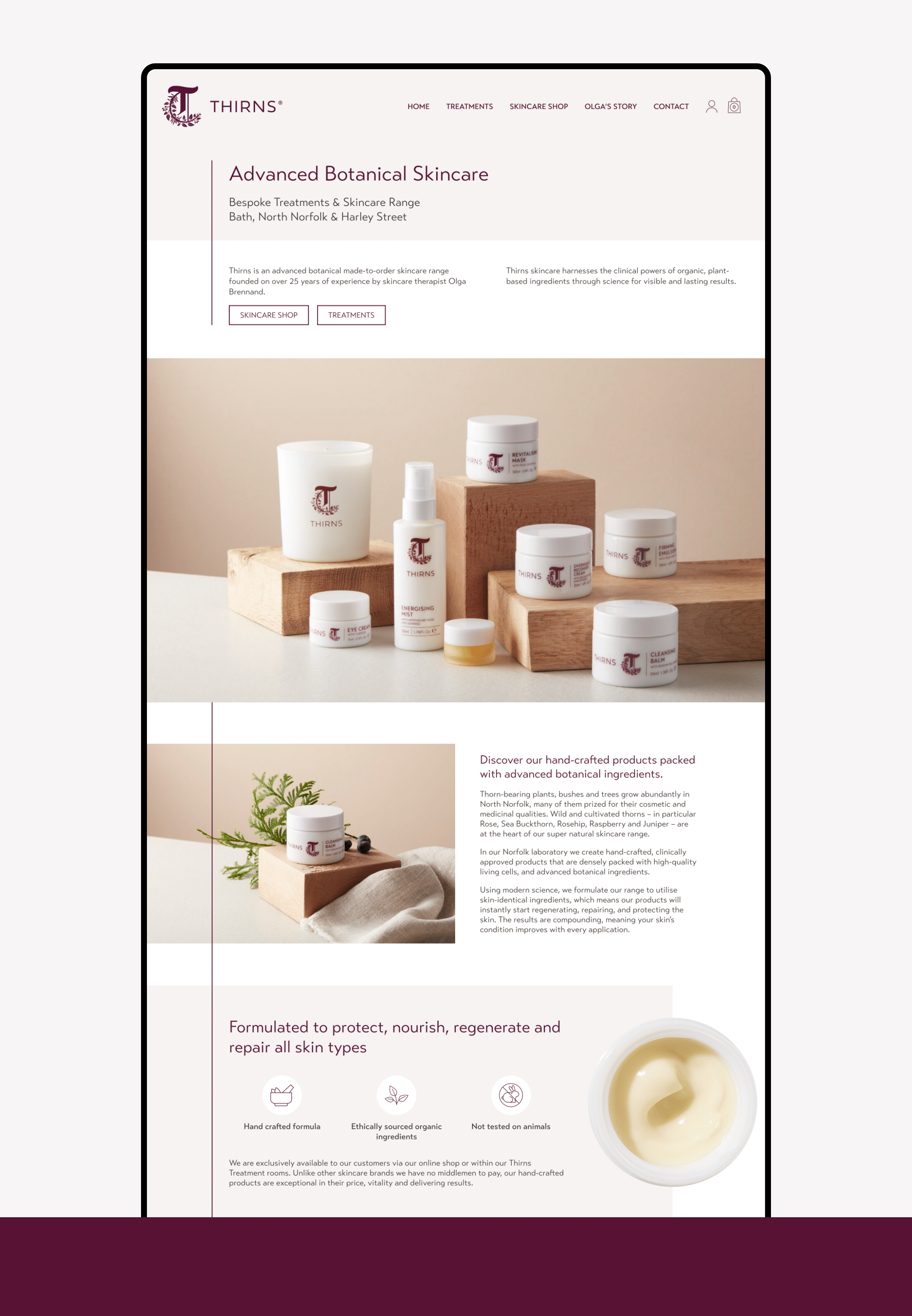 Logo, visual identity and website designed and developed for botanical skincare brand Thirns. The e-commerce website reflects the premium nature of the products, with a clean and elegant design that brings the brand story to life while providing an engaging shopping experience.